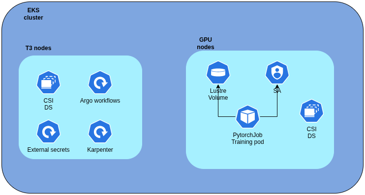 The cluster can run two distinct node groups. Static CPU nodes (for example t3a.large instances) handle cluster operations, workflow orchestration, and operational tools needed to run the desired setup; these stay running continuously. Dynamic GPU nodes, provisioned on-demand by Karpenter, provide elastic training capacity and exist only during active jobs.